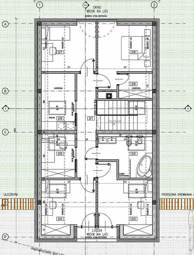 Na użytkowym poddaszu mamy większość powierzchni bez skosów. Na niewielkim fragmencie nadwieszonym poza lico ścian zewnętrznych parteru, znajduje się część sypialniana z pięcioma pokojami, łazienką oraz pralnią i garderobą. Dodatkowo na piętrze od strony południowo zachodniej, wydzieliliśmy niewielkie pomieszczenie przeznaczone na wypoczynek i integrację, łączące dwa pokoje dzieci.