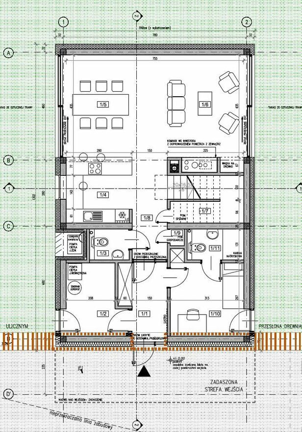 Zadaszoną strefę wejściową, z wejściem do budynku od strony południowo - zachodniej, część gospodarczą oraz część dzienną tj. jadalnią od strony północno- zachodniej i salonem od strony południowo wschodniej.