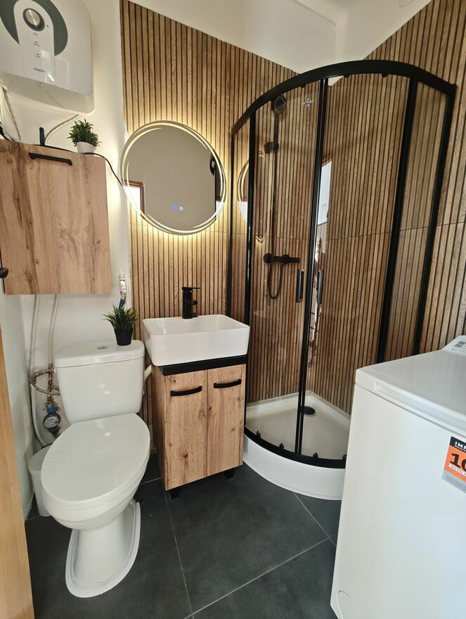 Mieszkanie składa sie z pokoiku z aneksem kuchennym (w kuchni lodówka, płyta elektryczna), oraz z wydzielonej łazienki z prysznicem oraz pralką.