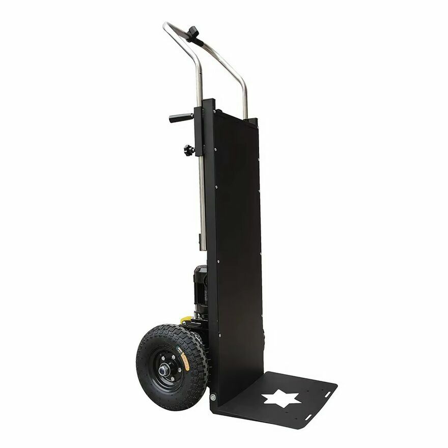Elektryczny wózek krokowy do transportu ciężkich ładunków po schodach, o udźwigu do 400 kg, zaprojektowany do bezpiecznego przenoszenia sprzętu AGD, mebli i paczek w górę oraz w dół schodów.